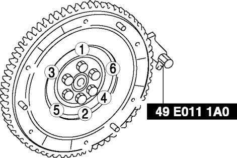 5. Temporarily tighten the lock bolts uniformly in the order of the numbers shown in the figure and install the flywheel.