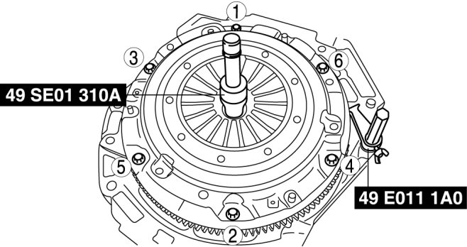 2. Tighten the bolts uniformly in the order of the numbers shown in the figure and install the clutch cover.