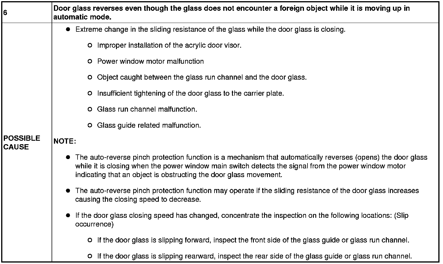 No.6 DOOR GLASS REVERSES EVEN THOUGH THE GLASS DOES NOT ENCOUNTER A FOREIGN OBJECT WHILE IT IS MOVING UP IN AUTOMATIC MODE [POWER WINDOW SYSTEMS (WITHOUT EXTERIOR OPEN FUNCTION)]