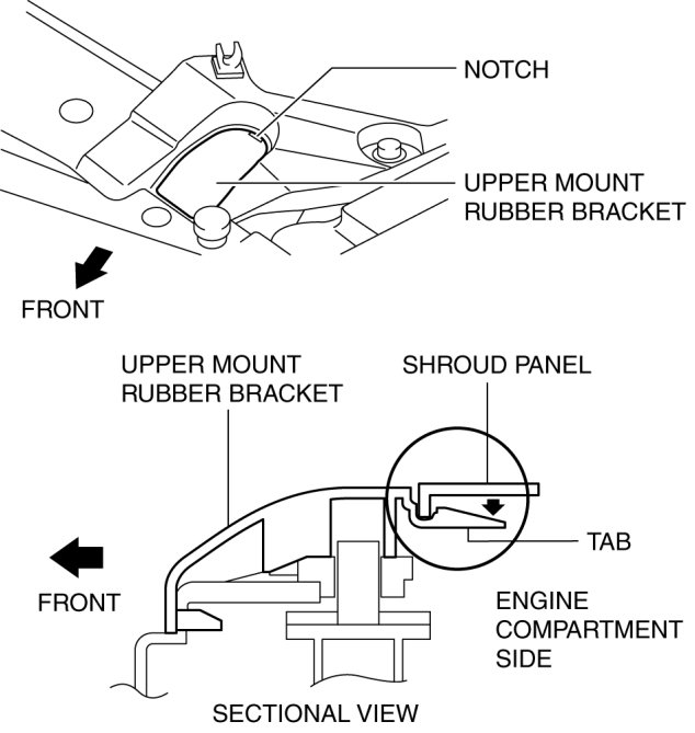 1. While pressing down the upper mount rubber bracket tab lightly in the direction of the arrow shown in the figure, press the upper mount rubber bracket toward the vehicle front.