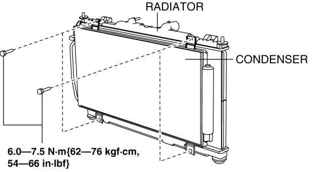 1. Remove the four bolts which secure the condenser to the radiator and set the condenser apart from the radiator.