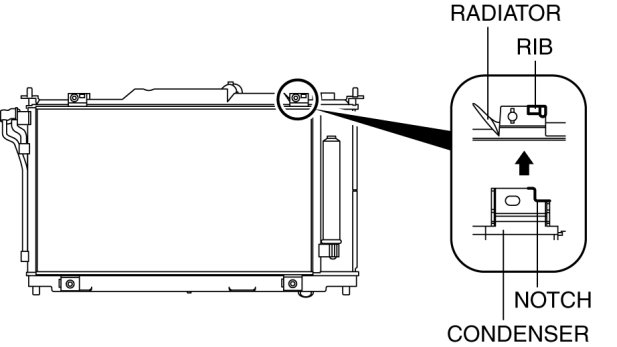 2. Align the bracket notch of the condenser to the radiator positioning rib.