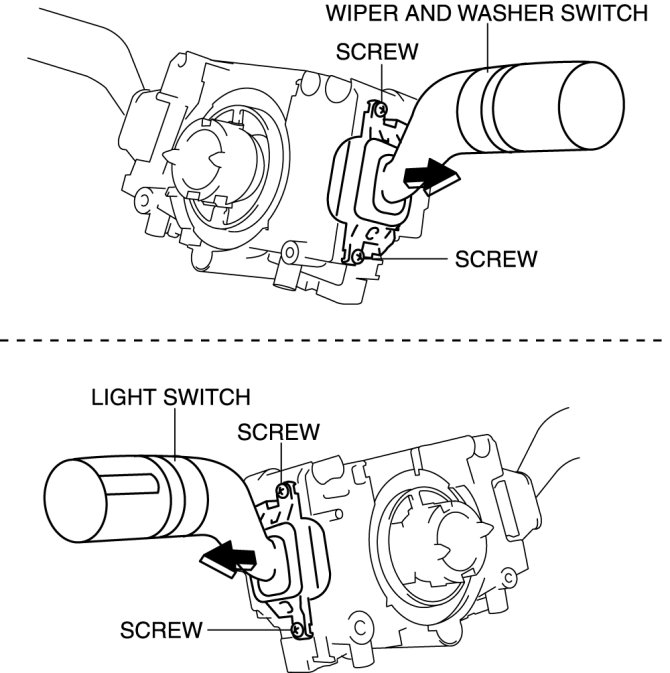 4. Remove the screws shown in the figures, then pull the light switch, and the wiper and washer switch in the direction of the arrow respectively to remove them.