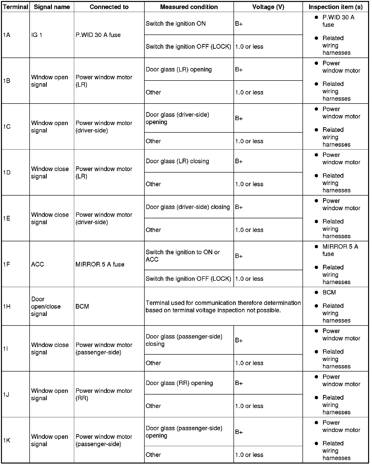 - If the voltage is not as specified in the terminal voltage table, inspect the parts under Inspection item (s) and related wiring harnesses.