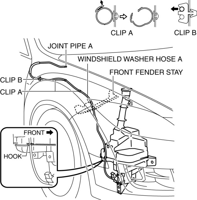 5. Disconnect the windshield washer hose from the joint pipe A.
