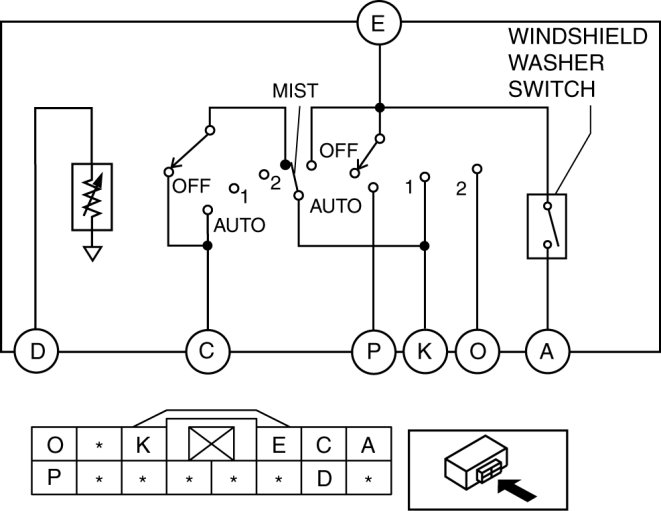 4. Verify that the continuity between the windshield wiper and washer switch terminals is as indicated in the table.