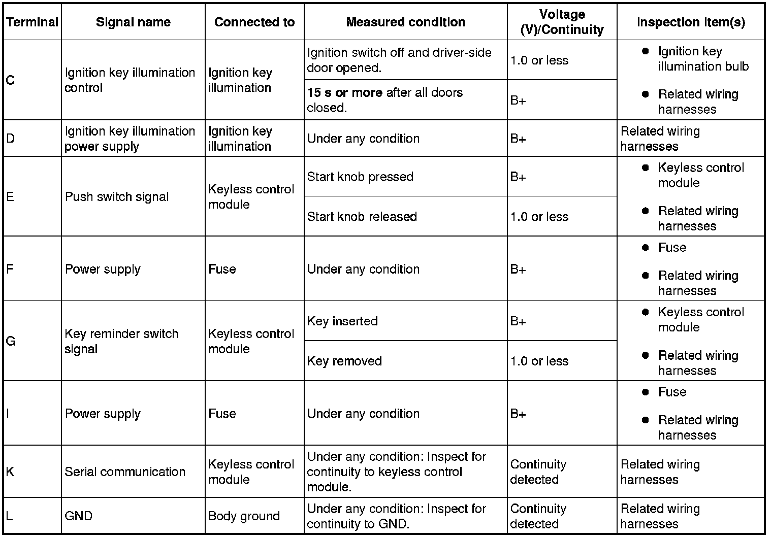1. Measure the voltage or inspect for continuity according to the Terminal Voltage Table (Reference).