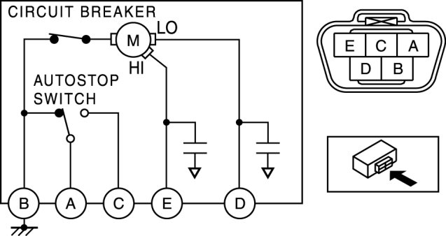 2. Connect battery positive voltage to windshield wiper motor terminal D or E, and ground to terminal B, then verify that the windshield wipers operate as shown in the table.