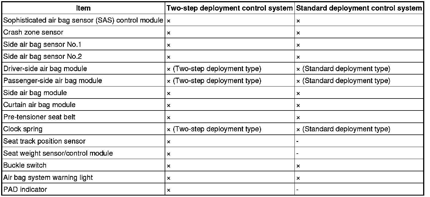 - Because two types of driver and passenger-side air bag module controls, "Two-step deployment control" and "Standard deployment control", are available depending on when the vehicle was produced, identify the specification referring to the following identification.