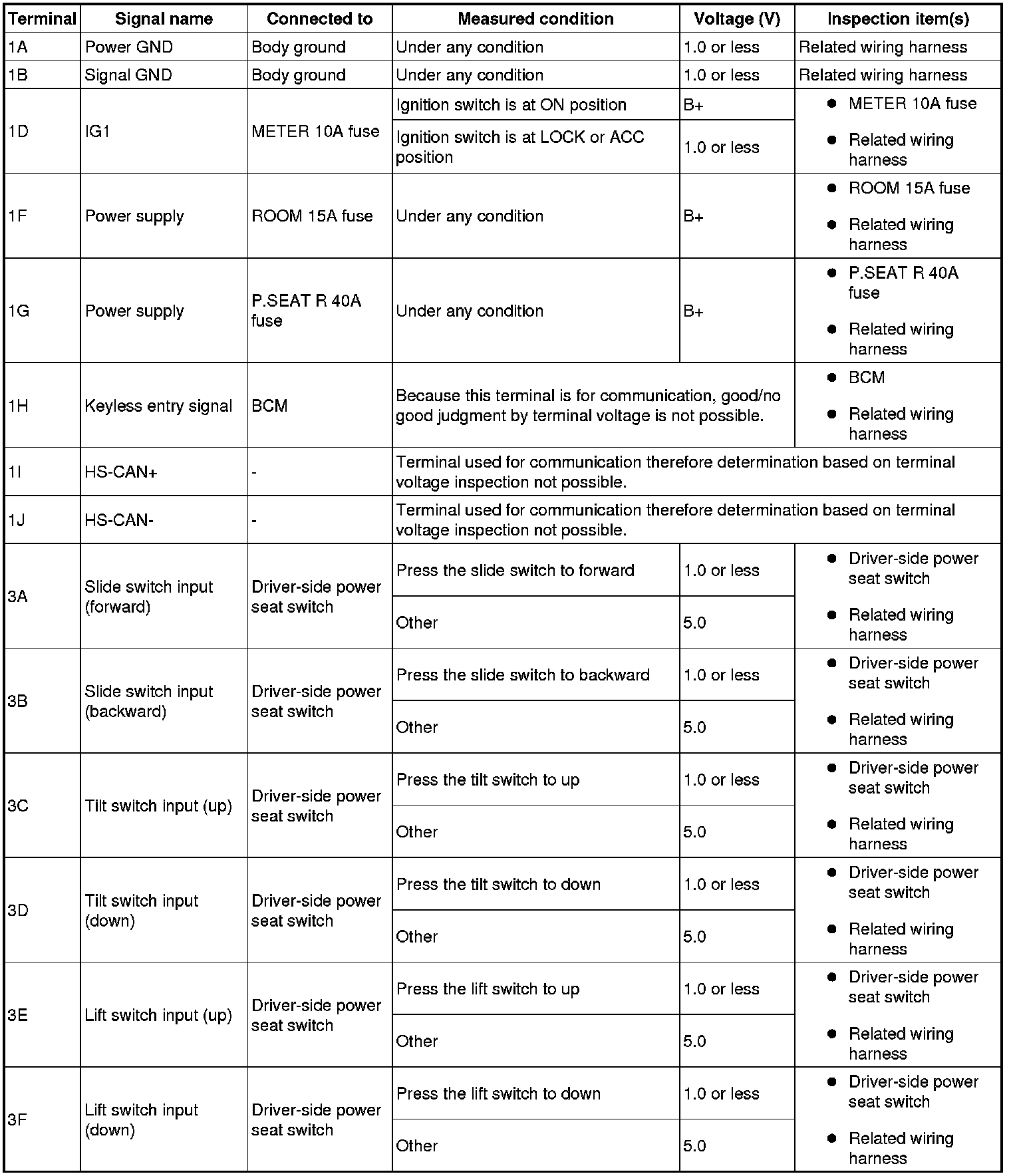 - If the voltage is not as specified in the Terminal Voltage Table (Reference), inspect the parts under "Inspection item(s)" and related wiring harnesses.
