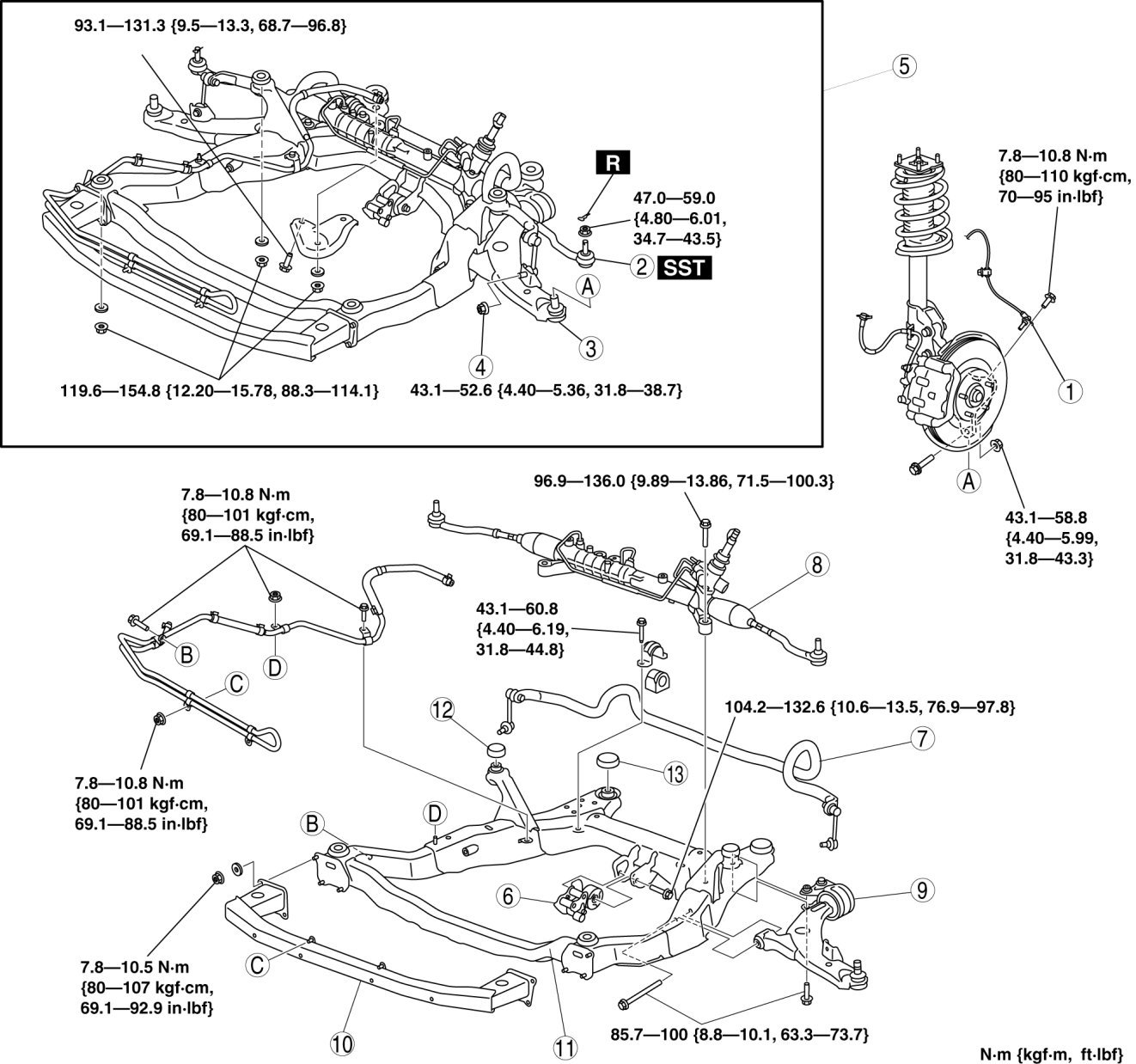 - Bolt A, B: 93.1-116.6 Nm {9.5-11.8 kgf-m, 68.7-85.9 ft-lbf}