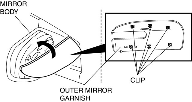 1. Position the outer mirror garnish against the mirror body in the direction of the arrow shown in the figure, and insert the outer mirror garnish clips (6 locations) into the mirror body.
