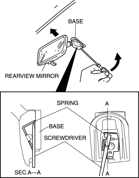 - When removing the rearview mirror, the mirror may hit the top sealing, possibly damaging it. Therefore, hold the mirror body securely by hand when removing the rear view mirror so that the mirror does not contact it.