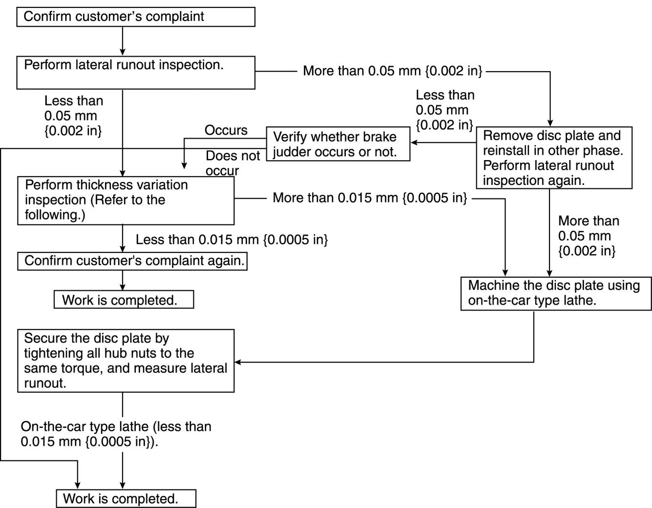 If the runout is more than 0.05 mm {0.002 in} at the position 10 mm {0.39 in} from the disc plate edge, uneven wear occurs on the disc plate because of uneven pad/plate contact.