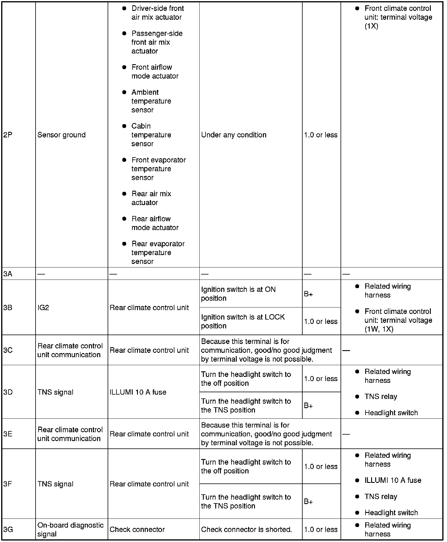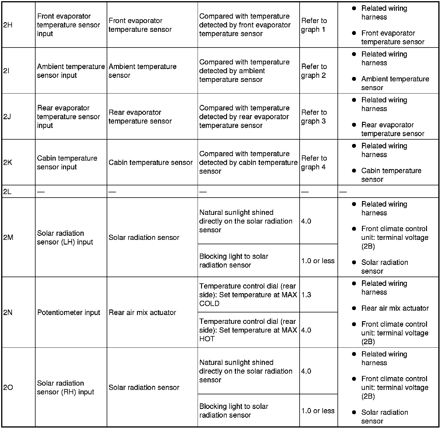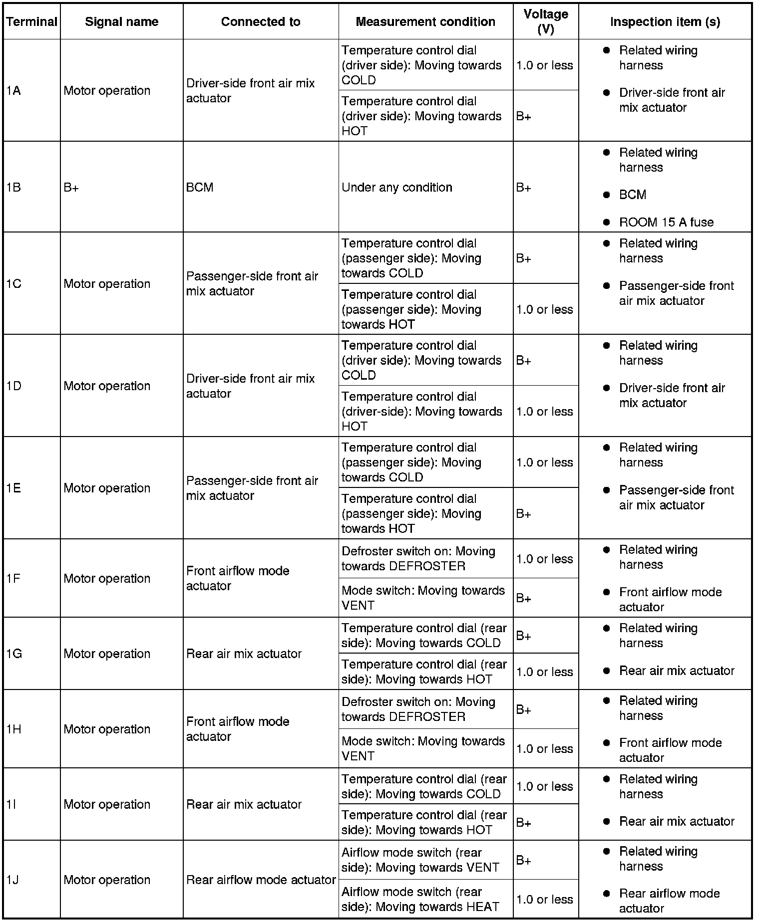 - If the parts under "Inspection item (s)" are found to be normal, replace the front climate control unit.