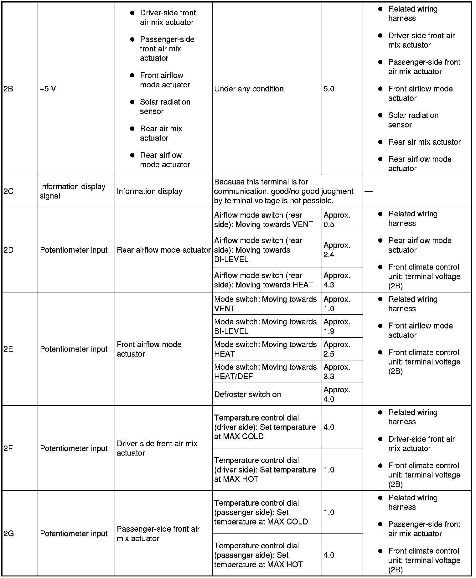 4. By inserting the positive (+) lead of the tester into each front climate control unit terminal, measure the voltage according to the terminal voltage table.