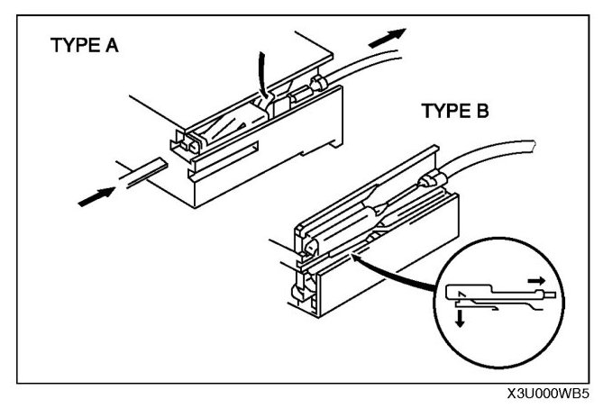 - Use the appropriate tools to remove a terminal as shown. When installing a terminal, be sure to insert it until it locks securely.