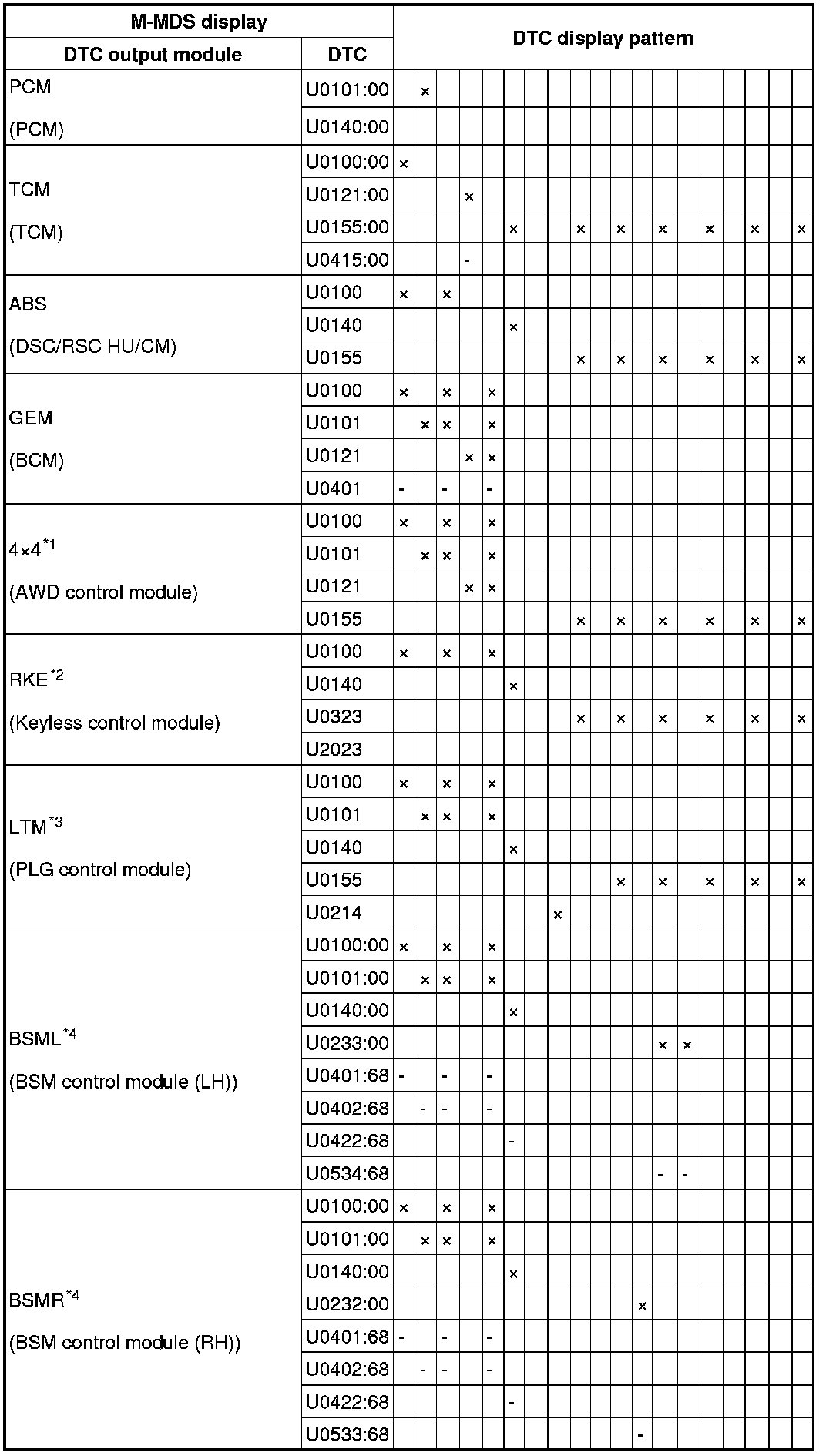 - A hyphen(-) in the DTC output pattern table indicates that the DTC may be displayed depending on the malfunction detection conditions. If only an (x) is indicated, it means the DTC will not be displayed.