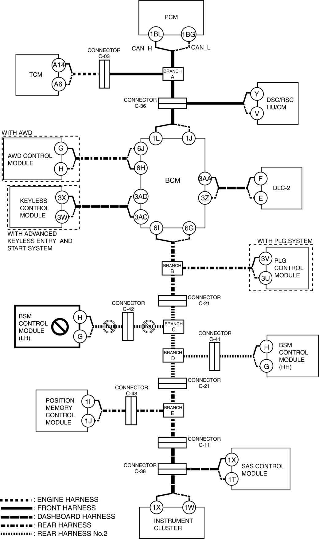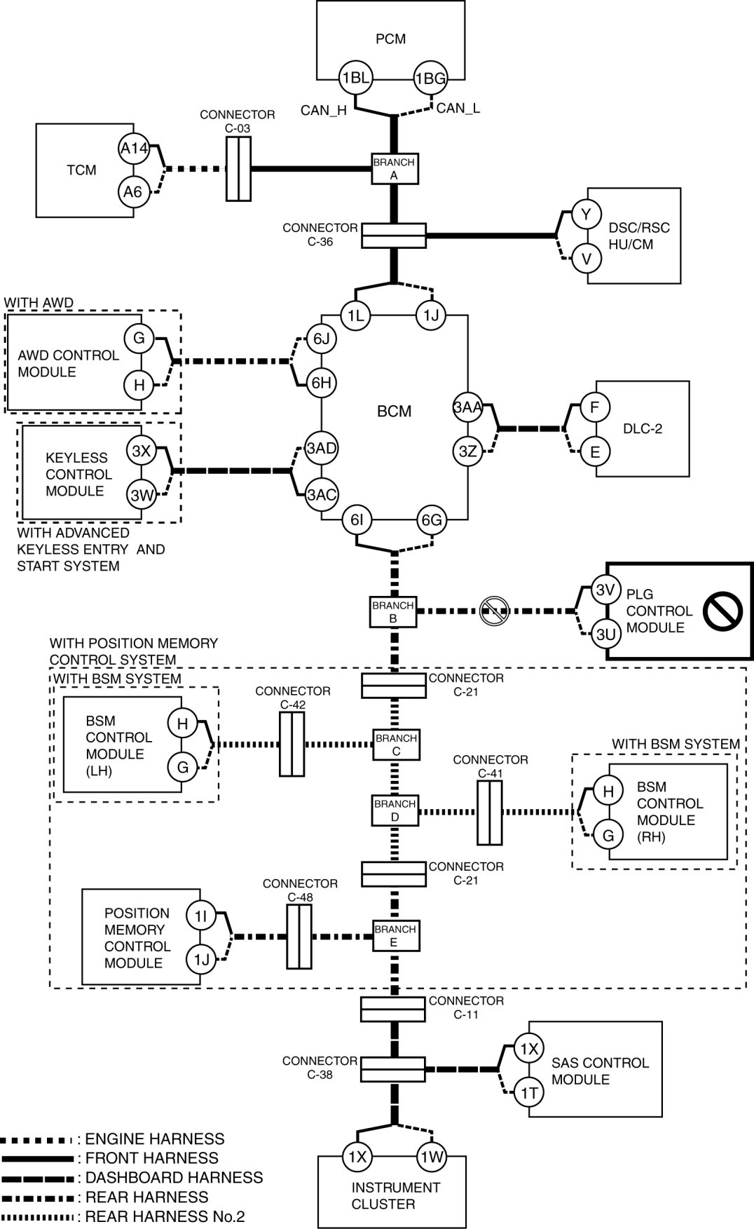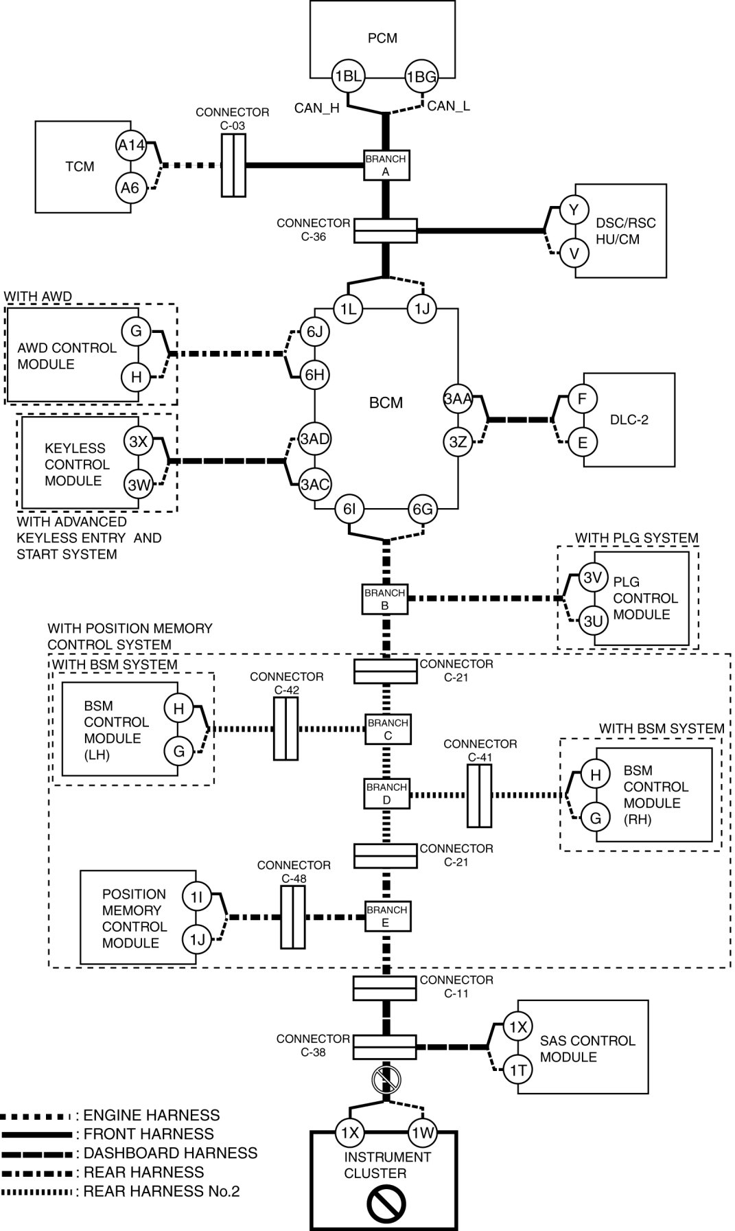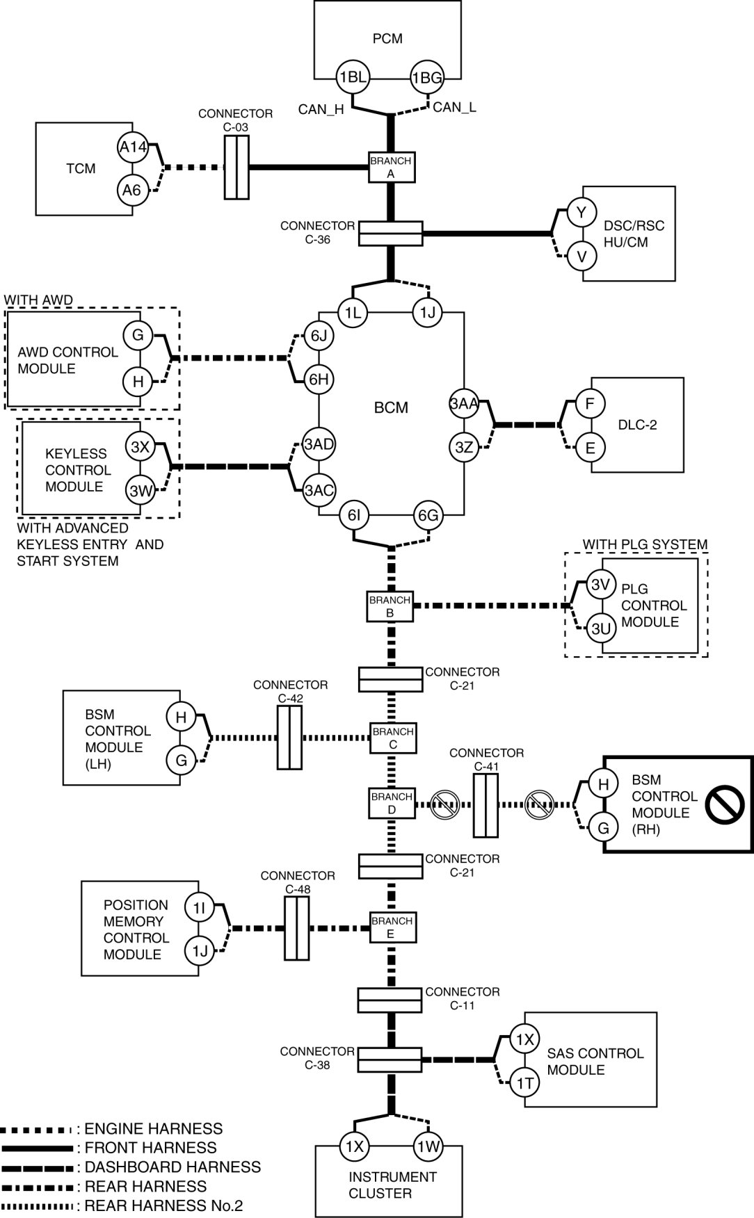 - Wiring harness between BCM terminal 1L and connector C-36