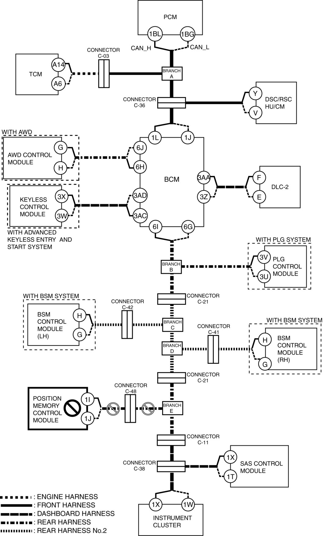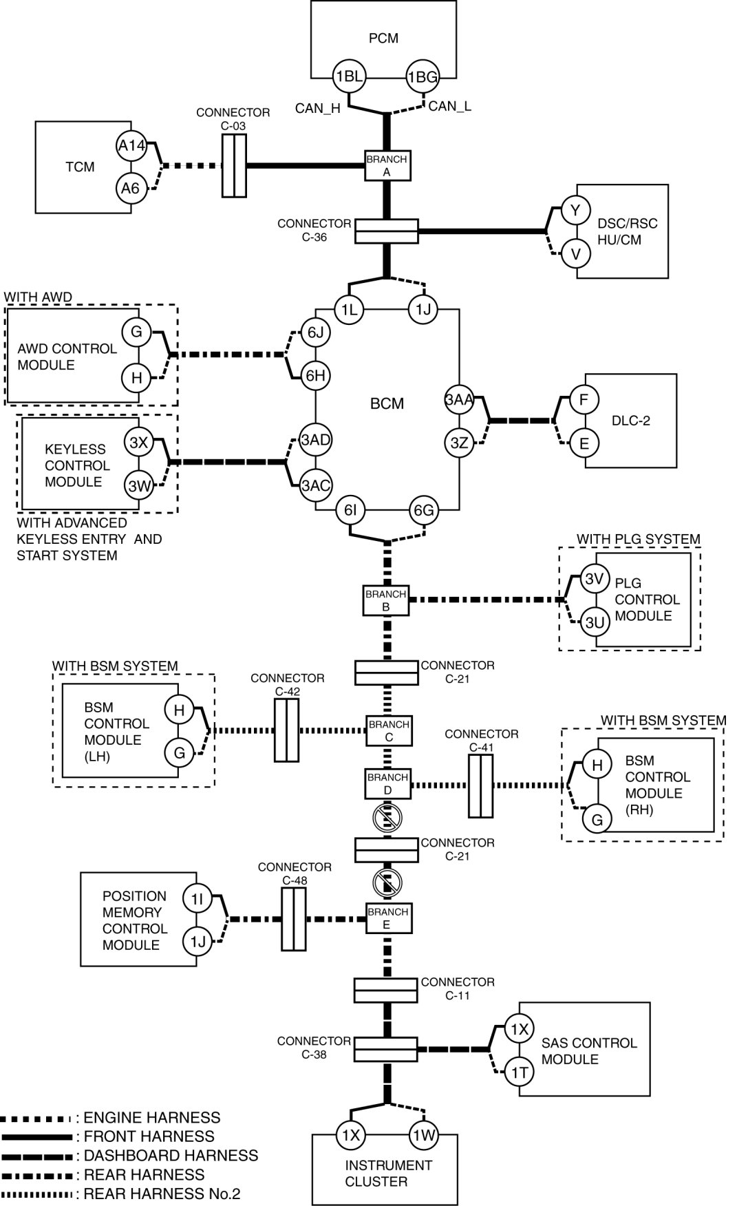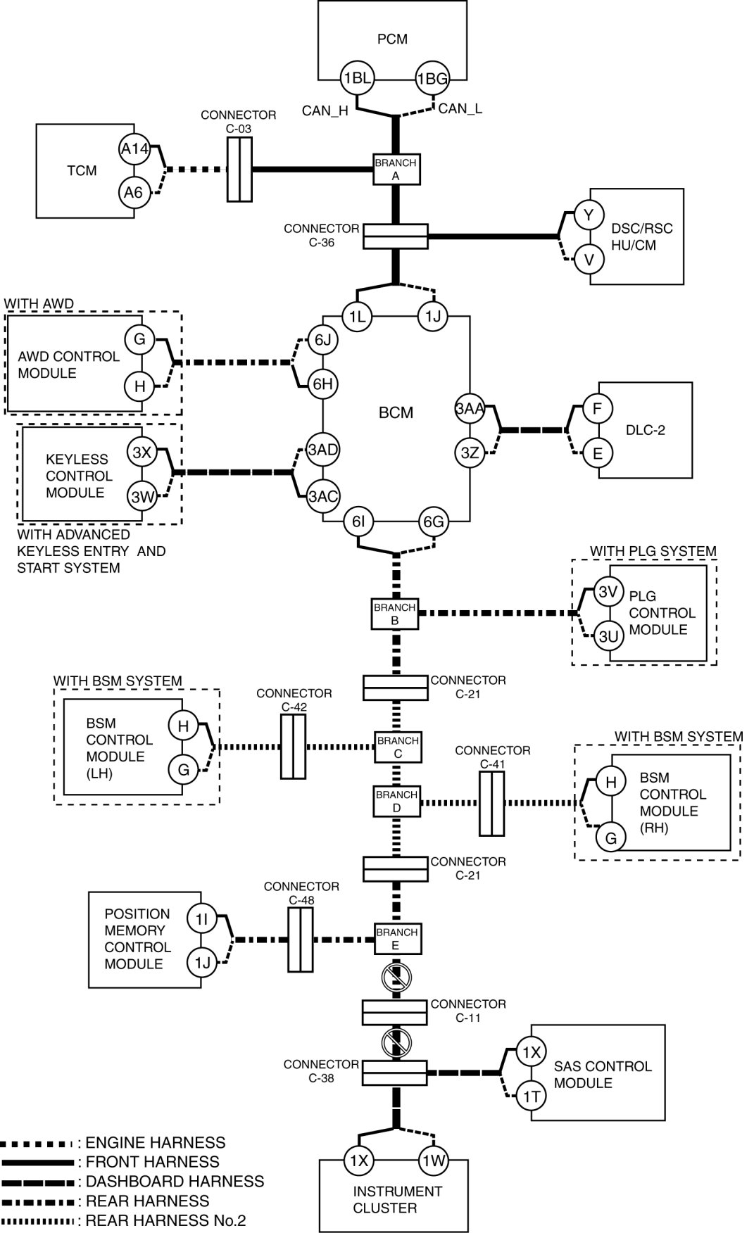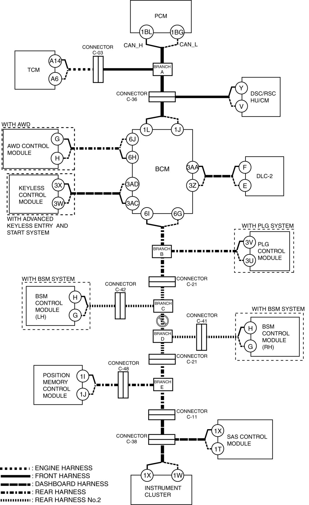 - Wiring harness between BCM terminal 1L and connector C-36