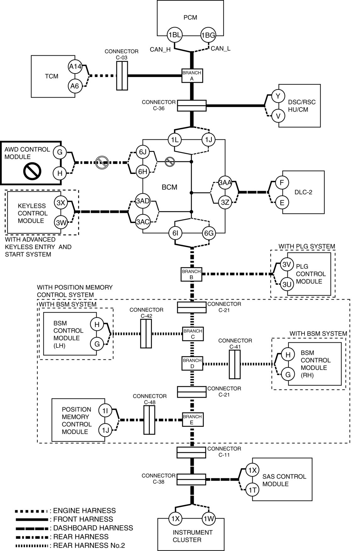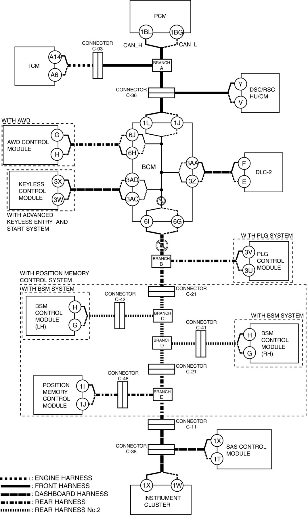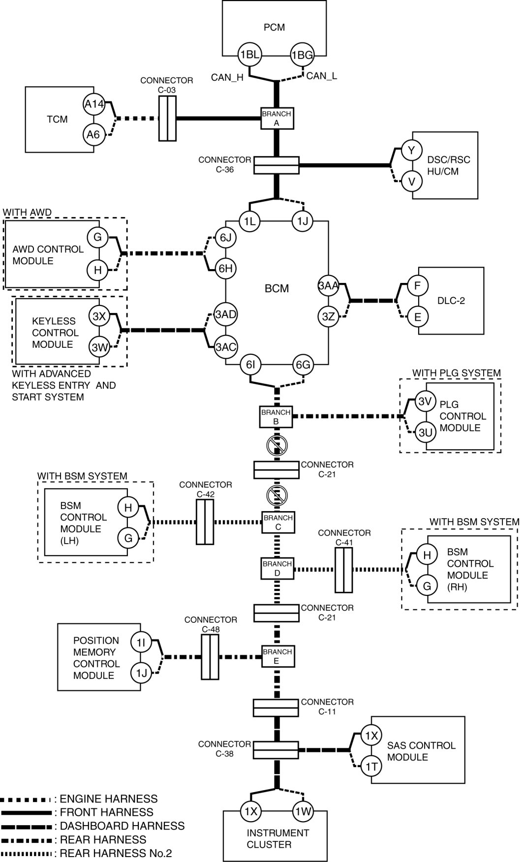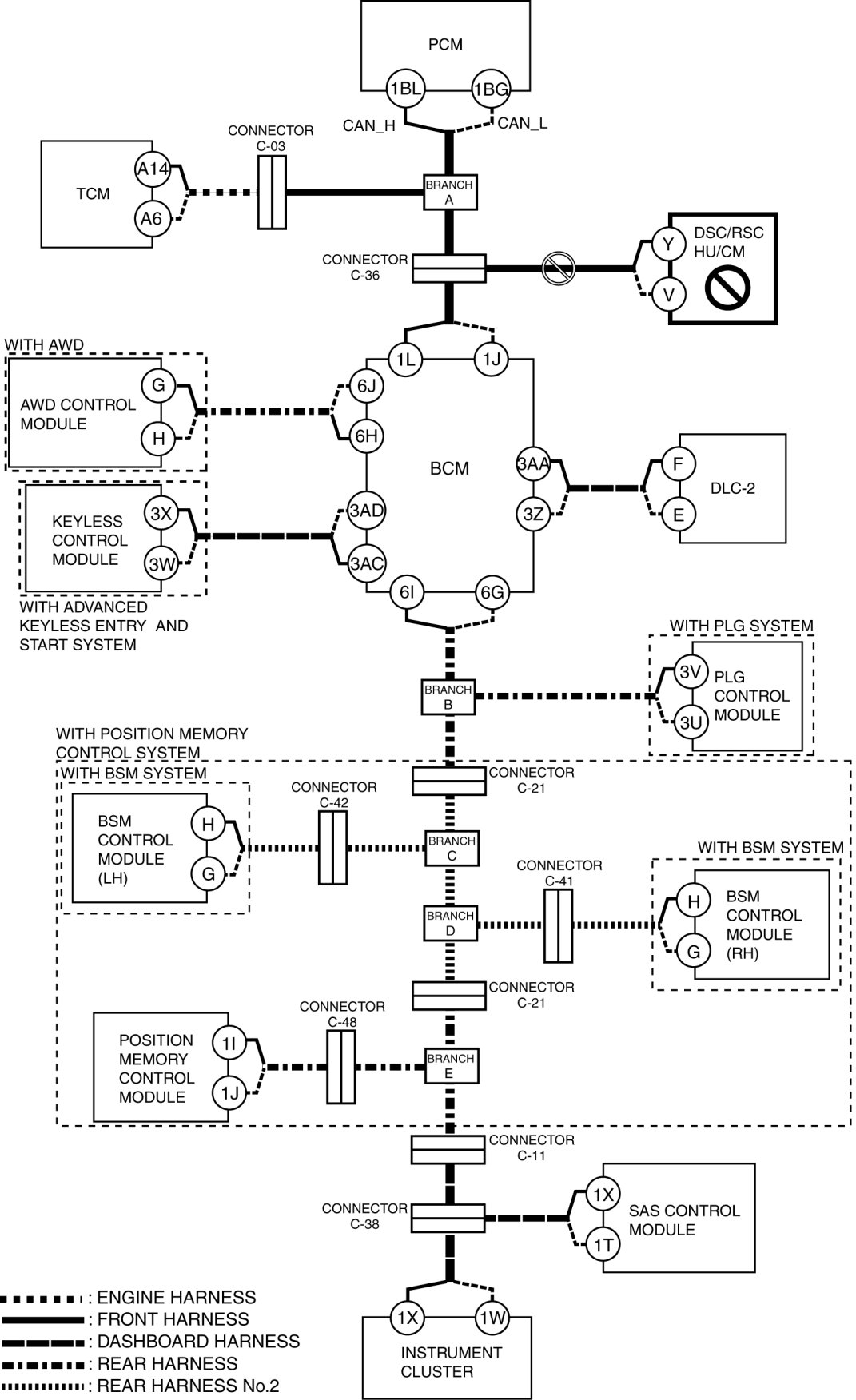 - Wiring harness between BCM terminal 1L and connector C-36