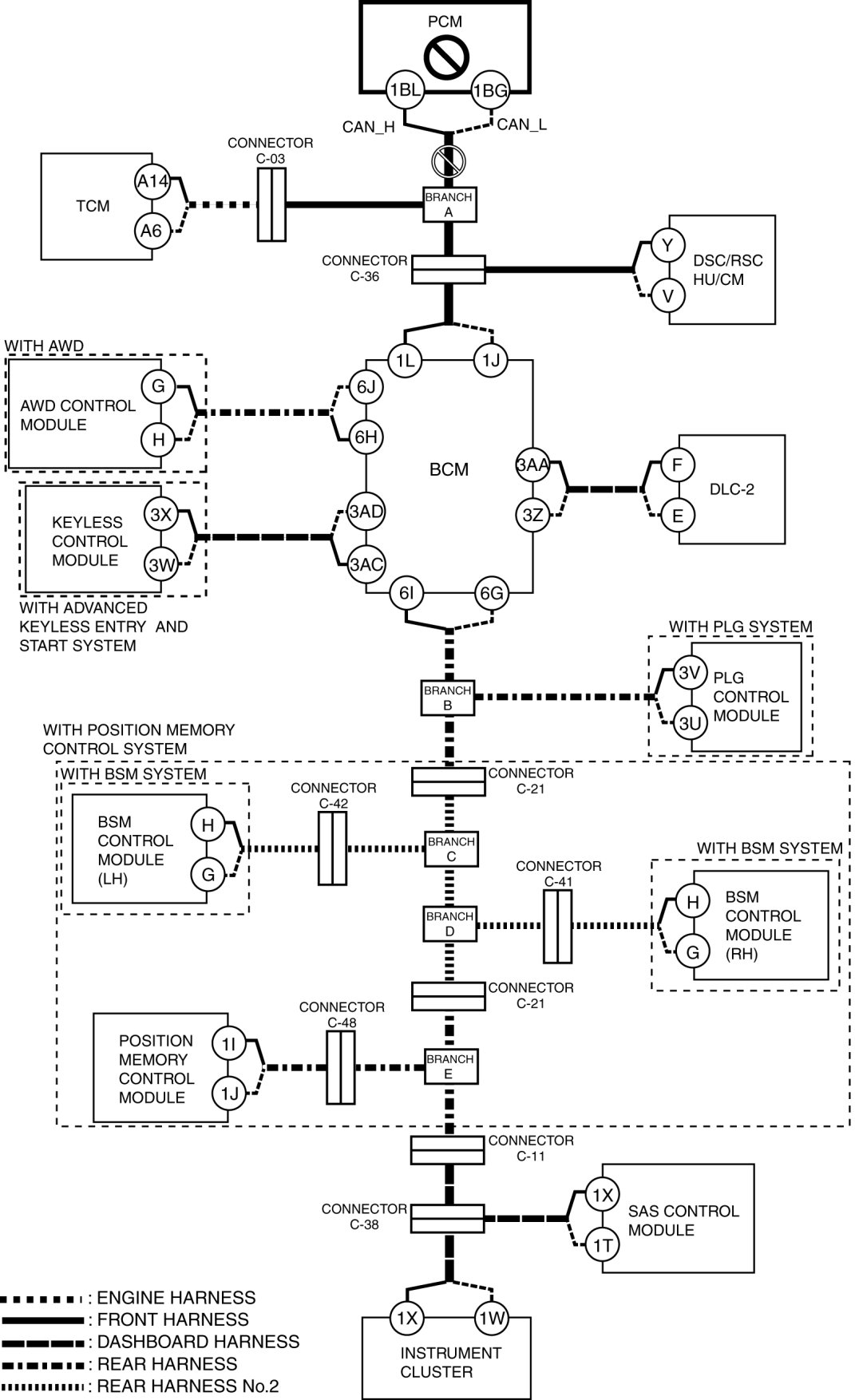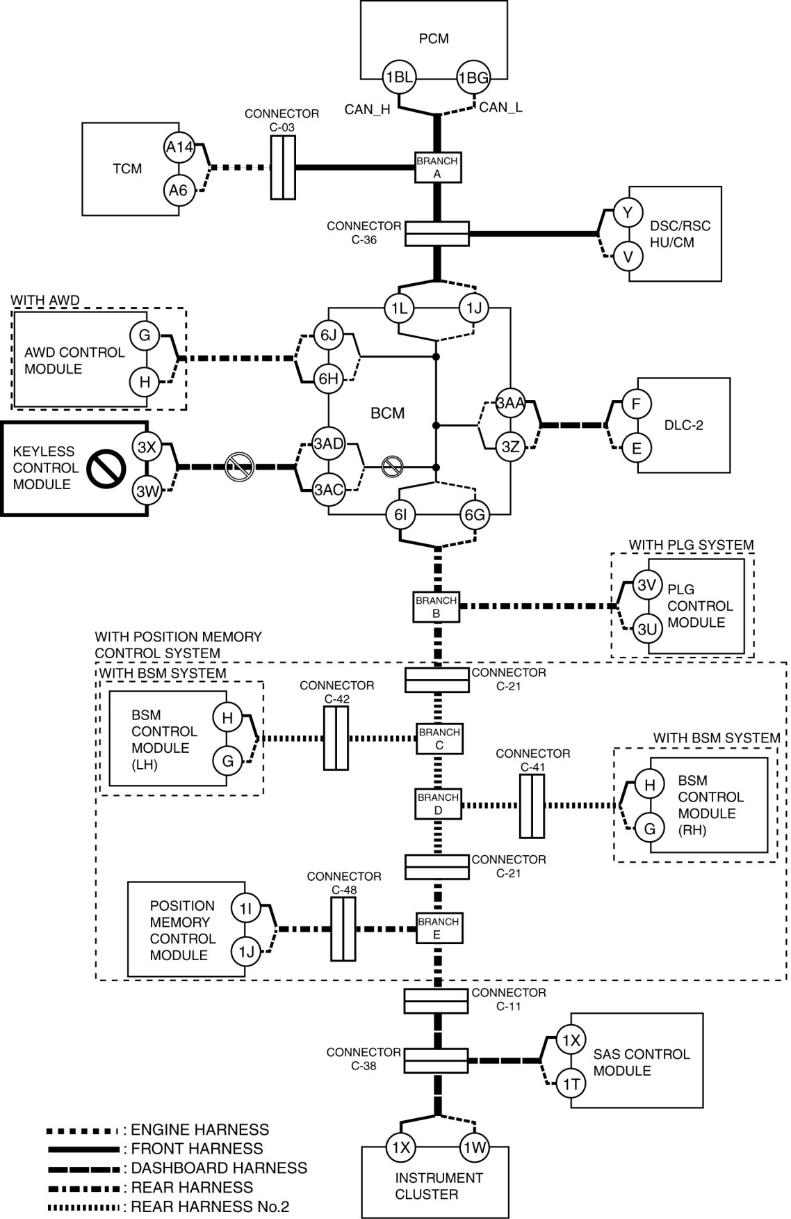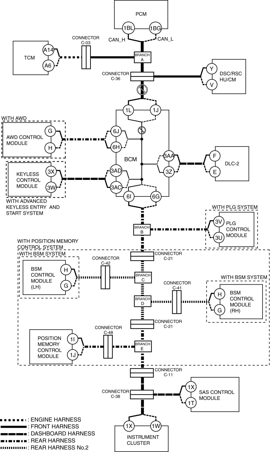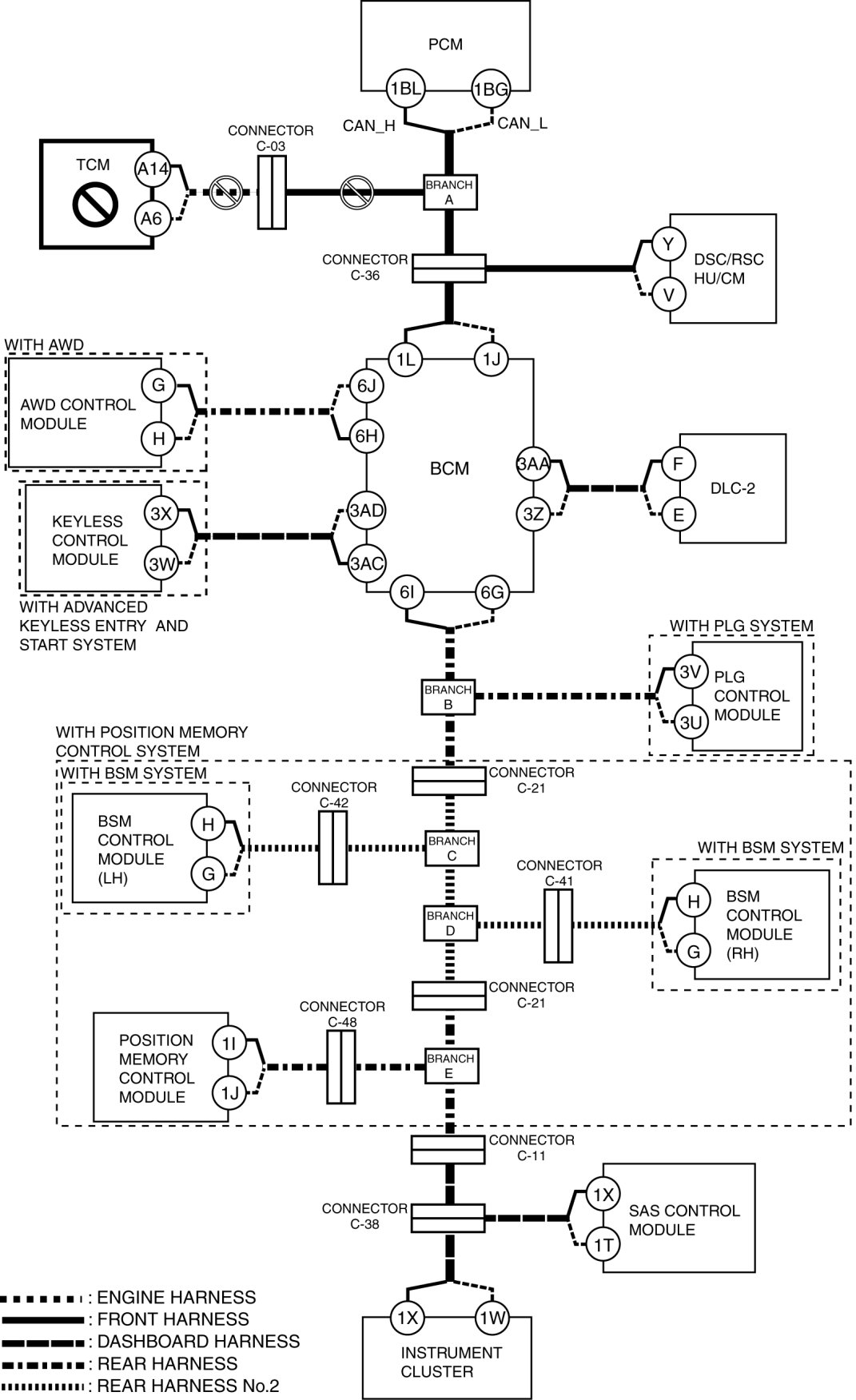 - Wiring harness between BCM terminal 1L and connector C-36