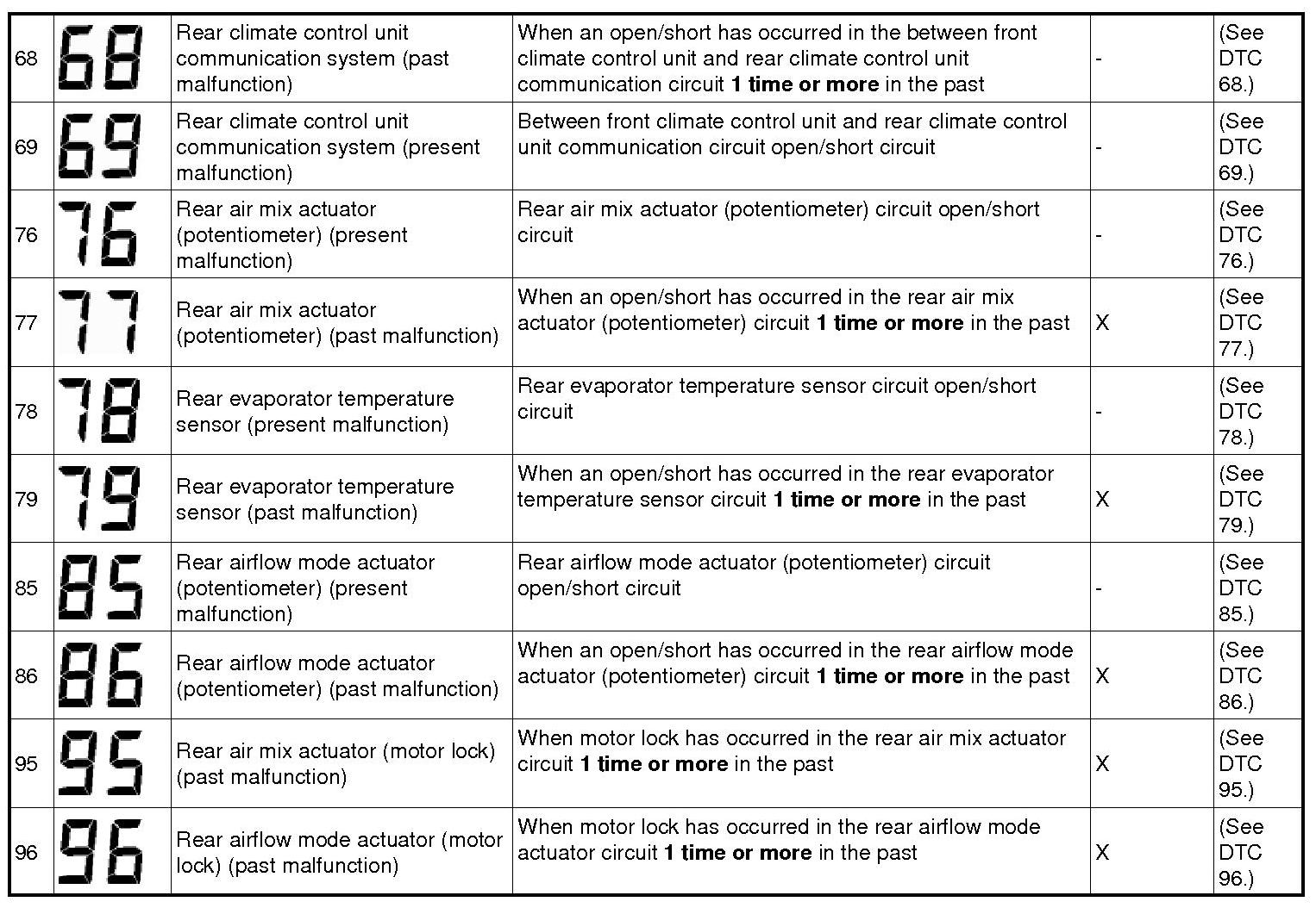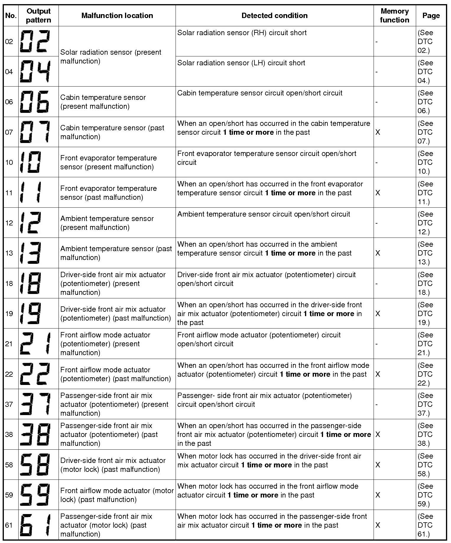 - If a diagnostic trouble code is indicated, refer to the following diagnostic trouble code table and inspect the appropriate system.
