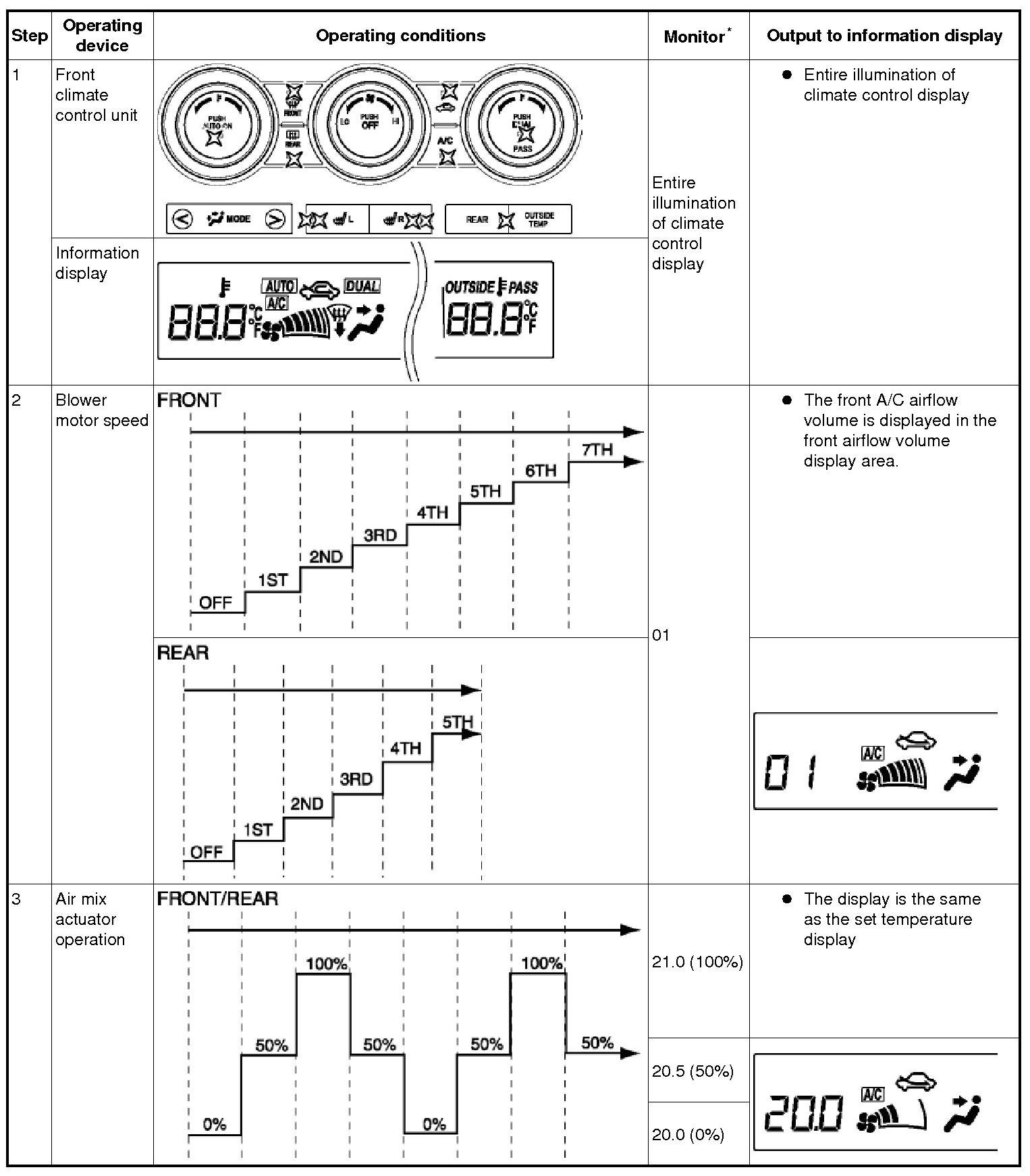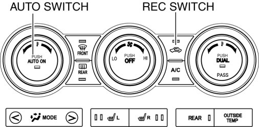 - When DTCs are displayed in the past failure indication mode, they remain in the memory after the failed systems are corrected. Consequently, the next time the past failure indication mode is used, the same past failure DTCs will be indicated on the information display. Therefore, erase the past failure memory after correcting all failed systems. To clear the past malfunction memory, press the AUTO and REC switches on the front climate control unit at the same time. Then "01" is displayed. If cleared, "00" will be indicated.