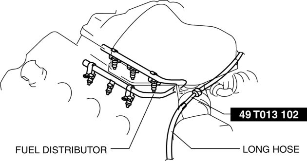 - Connect a long hose to the SST (49 T013 102) and drain the fuel into a container used for collecting gasoline.