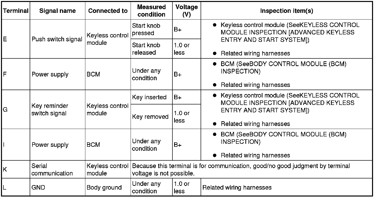 - If the voltage is not as specified in the Terminal Voltage Table (Reference), inspect the parts under "Inspection item(s)" and related wiring harnesses.