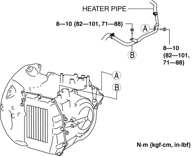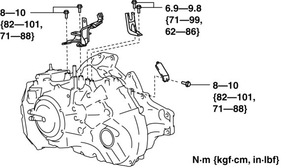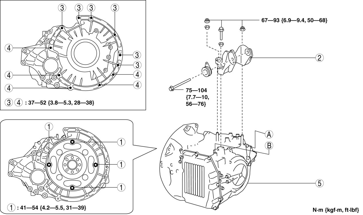- Bolt A, Nut B, C: 67-93 Nm {6.9-9.4 kgf-m, 50-68 ft-lbf}