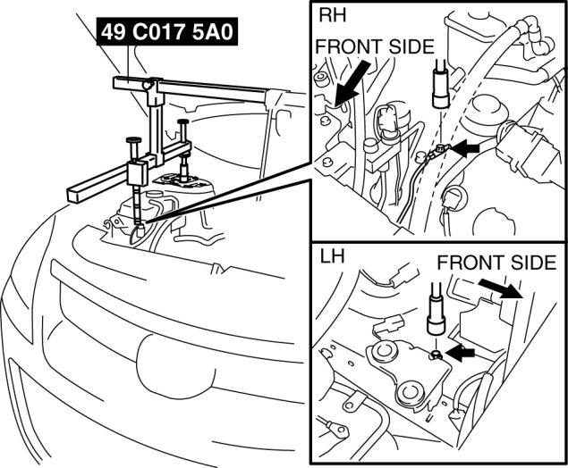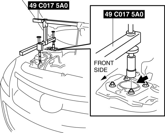 c. As shown in the figure, set the rear shafts of the SST to the left and right shock absorber nuts.