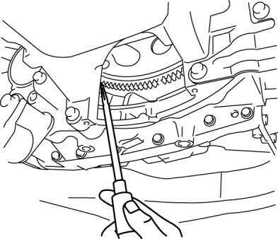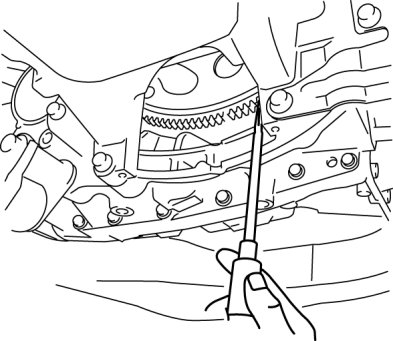 2. Insert a screwdriver through the converter housing service hole, and lock the drive plate.