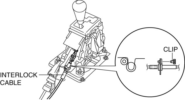 3. Remove the clip of the selector lever base plate, then remove the interlock cable from the U-groove.