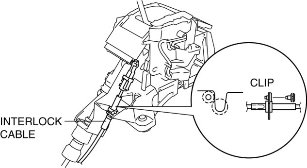 18. Fit the interlock cable in the U-groove in the selector lever base plate and install the clip.