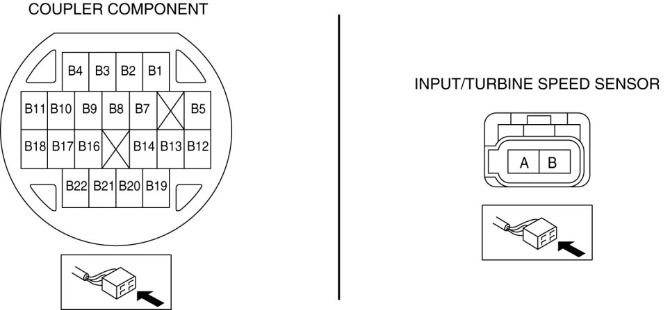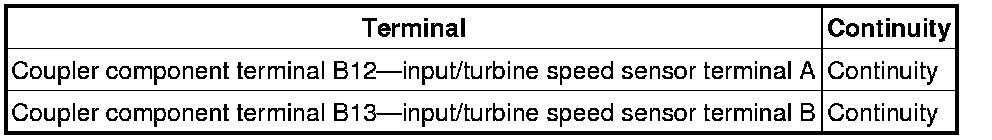 - Measure the continuity between coupler component terminal B13 and input/turbine speed sensor terminal B.