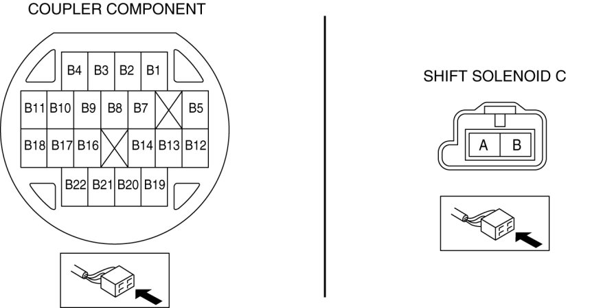- Measure the continuity between coupler component terminal B11 and shift solenoid C terminal B.