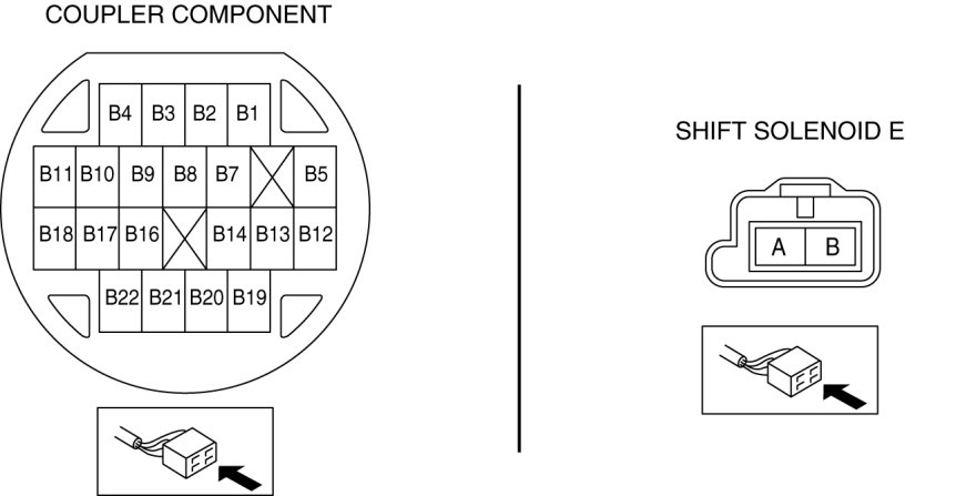 - Measure the continuity between coupler component terminal B22 and shift solenoid E terminal A.