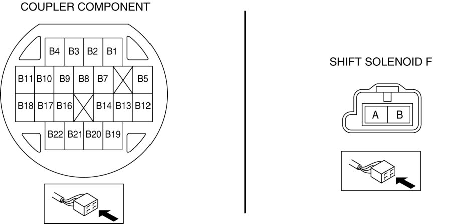 - Measure the continuity between coupler component terminal B21 and shift solenoid F terminal B.