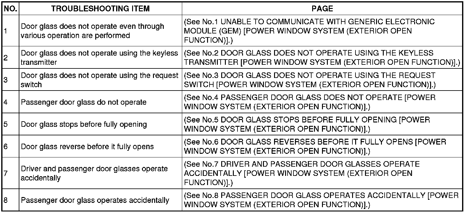 SYMPTOM TROUBLESHOOTING CHART [POWER WINDOW SYSTEM (EXTERIOR OPEN FUNCTION)]