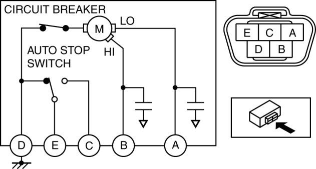 5. Connect battery positive voltage to windshield wiper motor terminal A or B, and ground to terminal D, then verify that the windshield wipers operate as shown in the table.