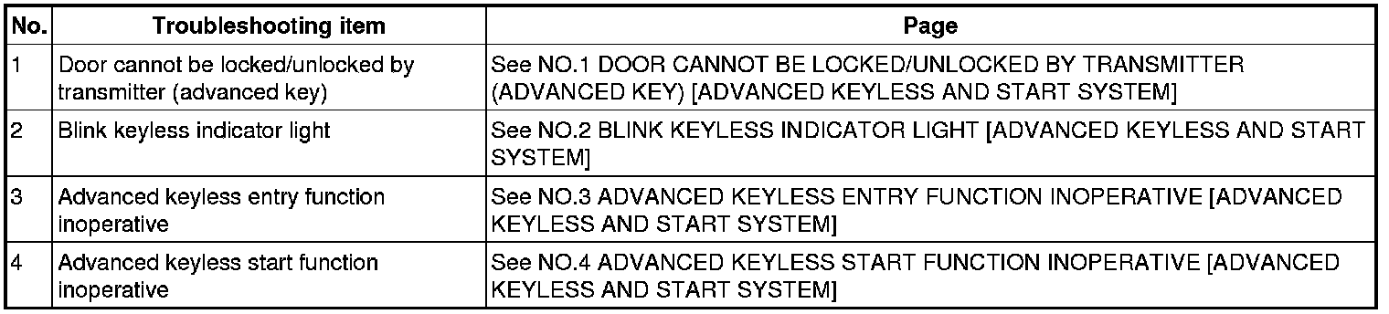 SYMPTOM TROUBLESHOOTING CHART [ADVANCED KEYLESS AND START SYSTEM]
