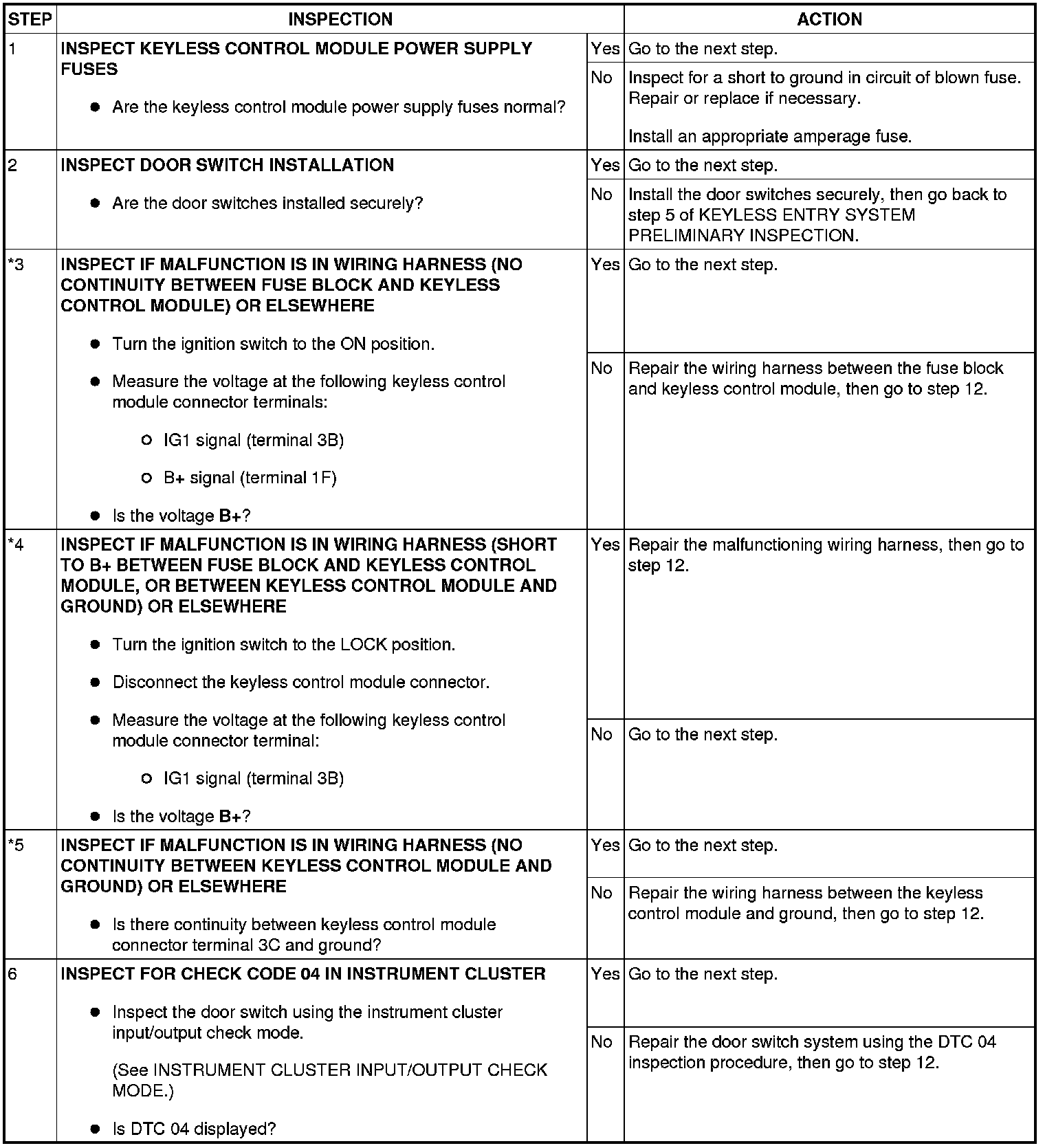- When performing an asterisked (*) troubleshooting inspection, slightly shake the wiring harness and connectors while performing the inspection to discover whether poor contact points are the cause of any intermittent malfunctions. If there is a problem, verify that the connectors, terminals and wiring harnesses are connected correctly and undamaged.