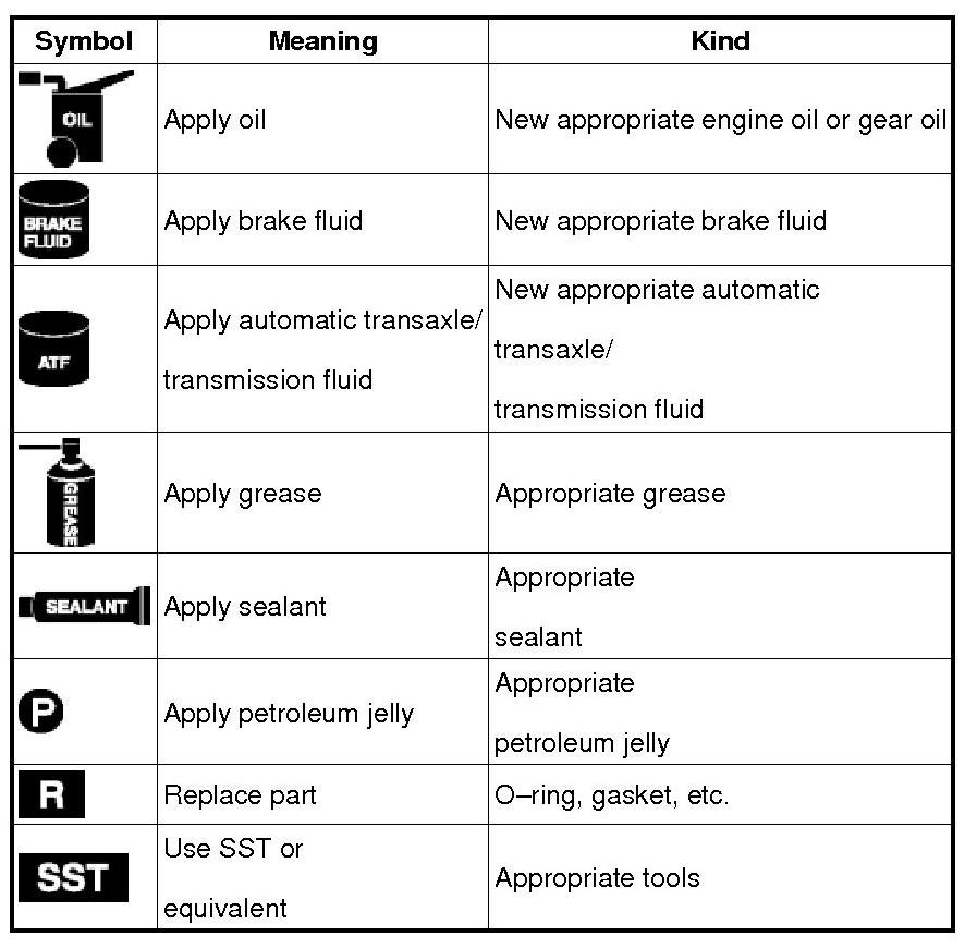 - There are eight symbols indicating oil, grease, fluids, sealant, and the use of SST or equivalent. These symbols show application points or use of these materials during service.