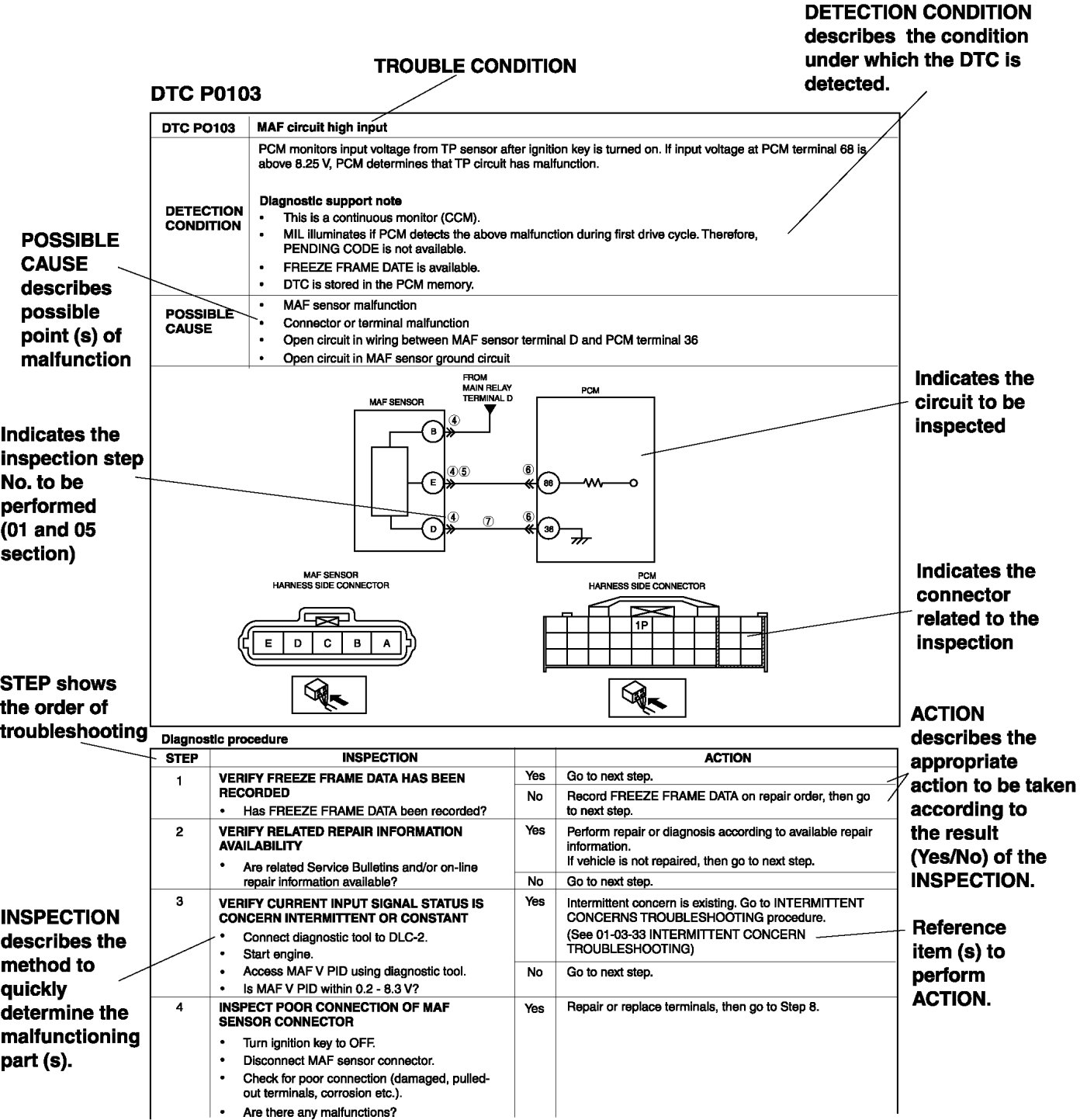 - DTC troubleshooting flow shows diagnostic procedures, inspection methods, and proper action to take for each DTC.