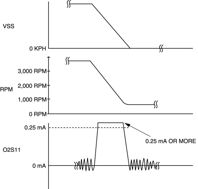 4. Verify that the A/F sensor current (PID: O2S11) is 0.25 mA or more while decelerating as shown in the figure.