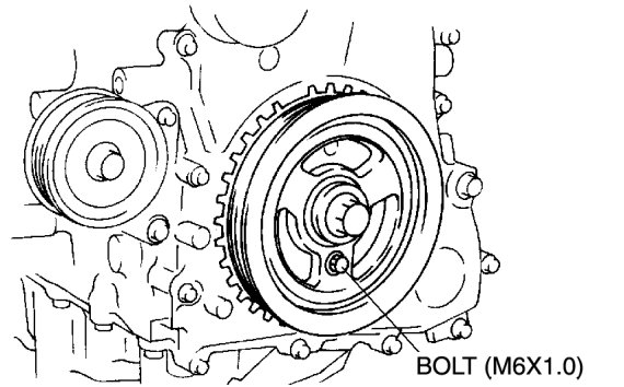 Harmonic Balancer - Crankshaft PulleyTo position the crankshaft pulley, temporarily tighten it and, using a suitable bolt (M6 X 1.0 length 25 mm-35 mm {0.99 in-1.37 in}), fix the crankshaft pulley to the engine front cover.