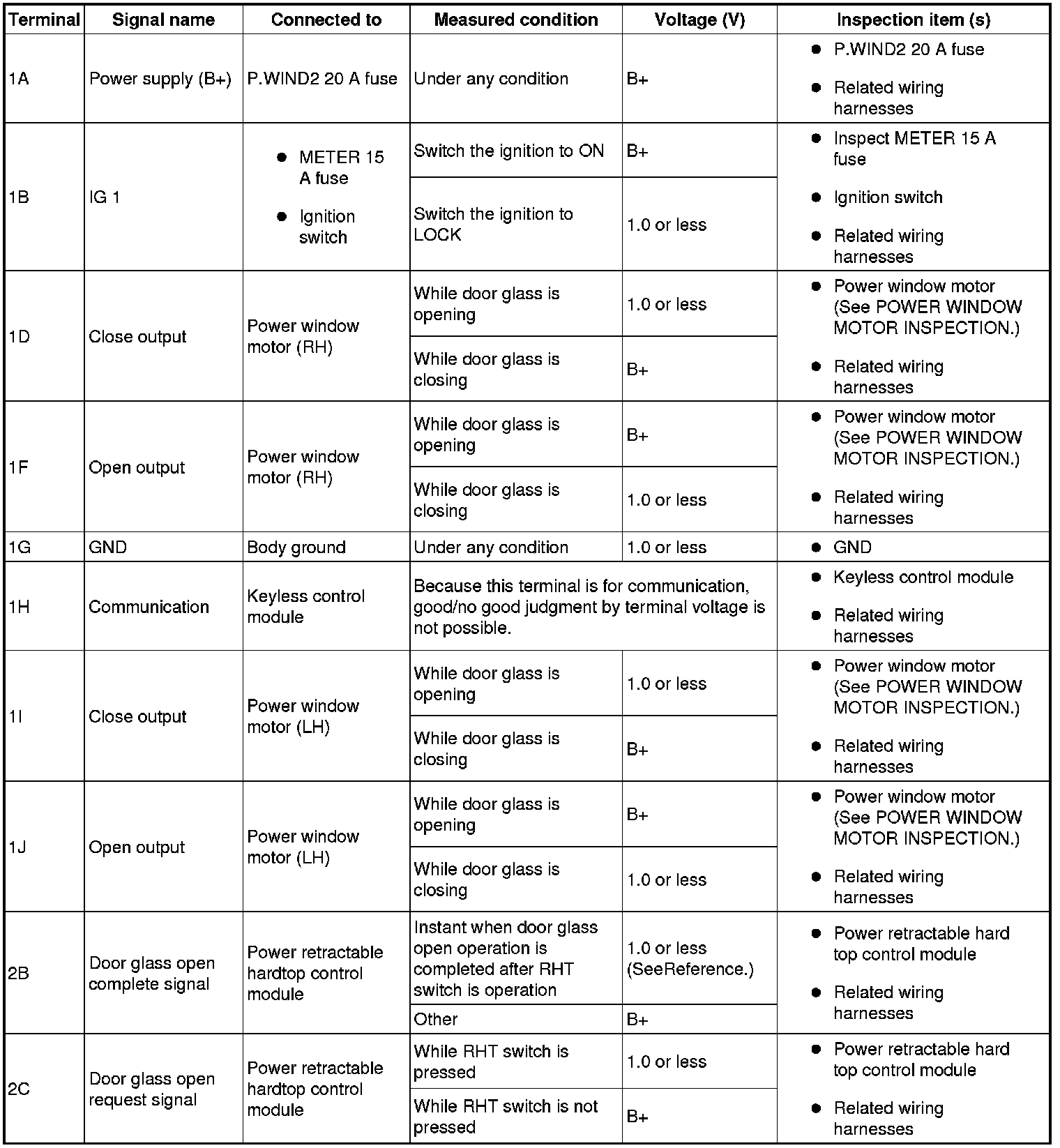 - If the voltage is not as specified in the terminal voltage table (reference), inspect the parts under Inspection item(s) and related wiring harnesses.