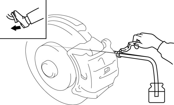 5. While the brake pedal is depressed, the other should loosen the bleeder screw using a commercially available flare nut wrench, drain out any fluid containing air bubbles, and tighten the bleeder screw.