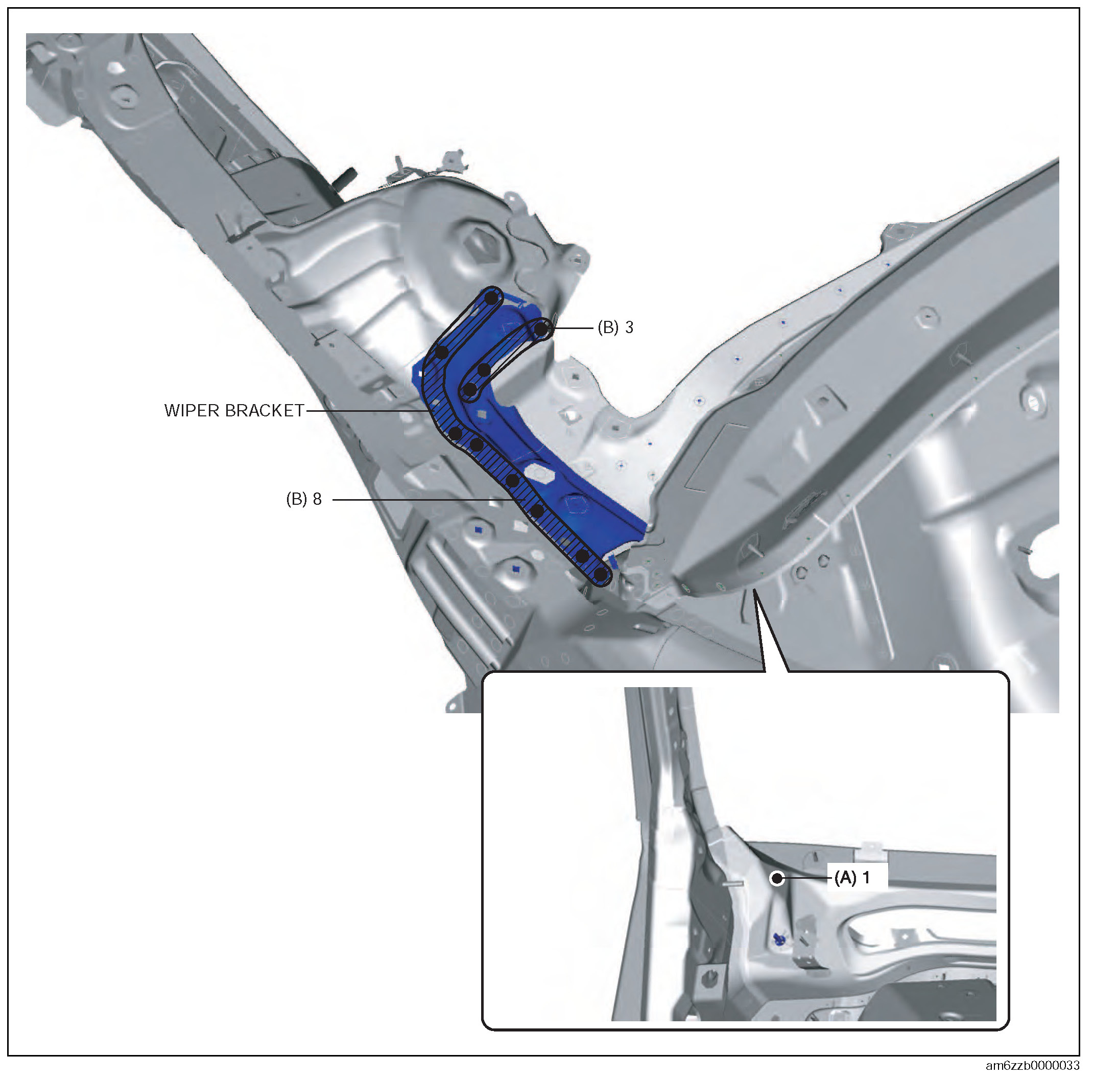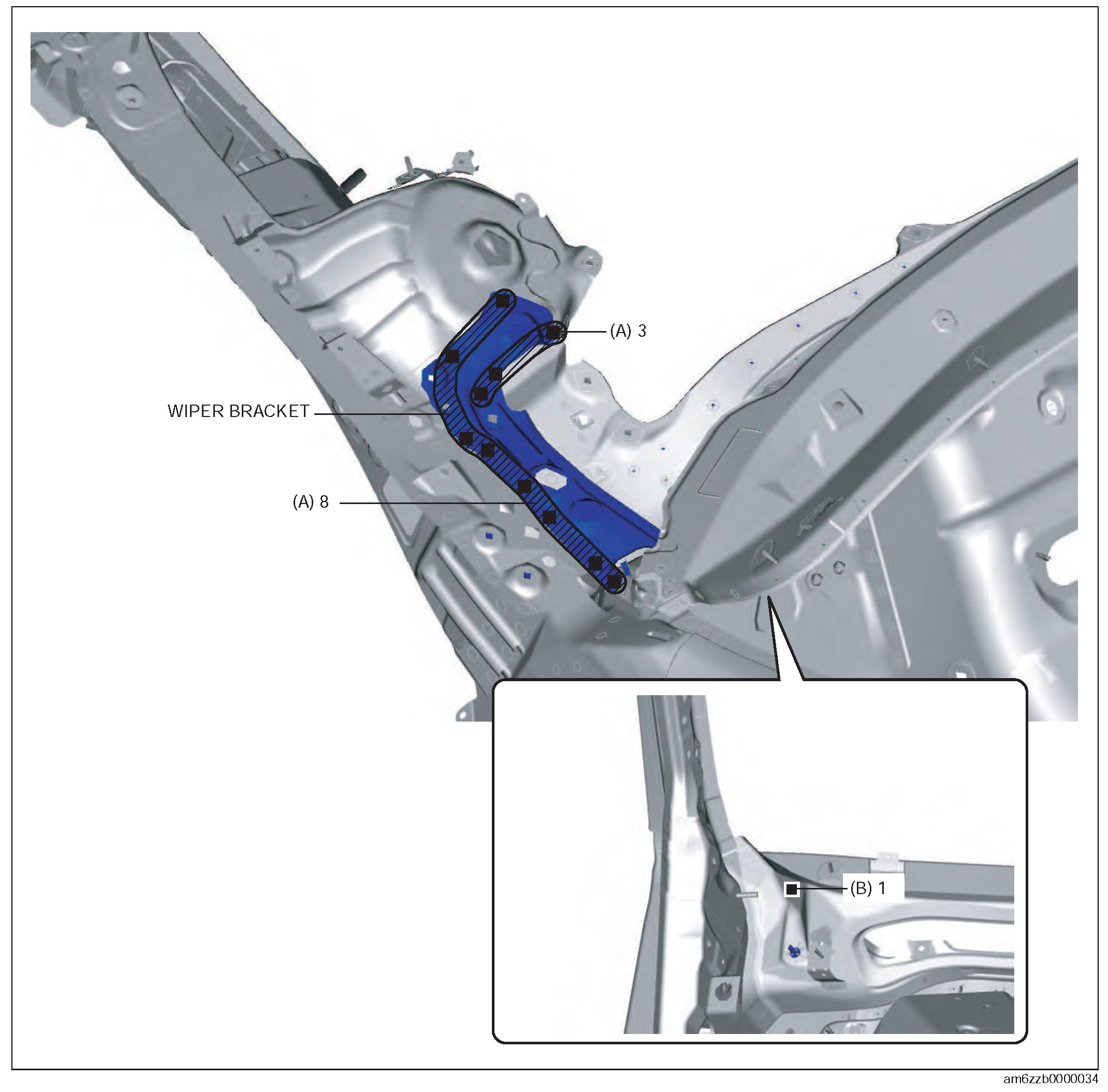 5. Plug weld the 1 location indicated by (B) from the inside shown in the figure, then install the wiper bracket.